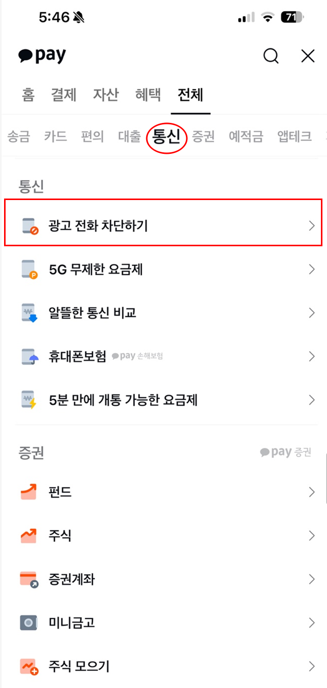 4. 통신 메뉴 클릭 → 광고 전화 차단하기 클릭