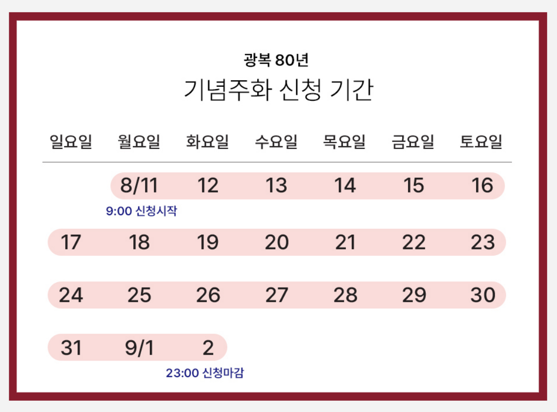 2. 광복 80주년 기념주화 예약 예약 신청 기간 및 방법