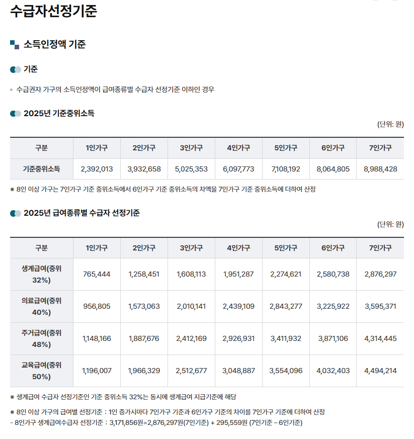 - 부양의무자 기준: 일부 급여는 부양의무자 소득도 고려