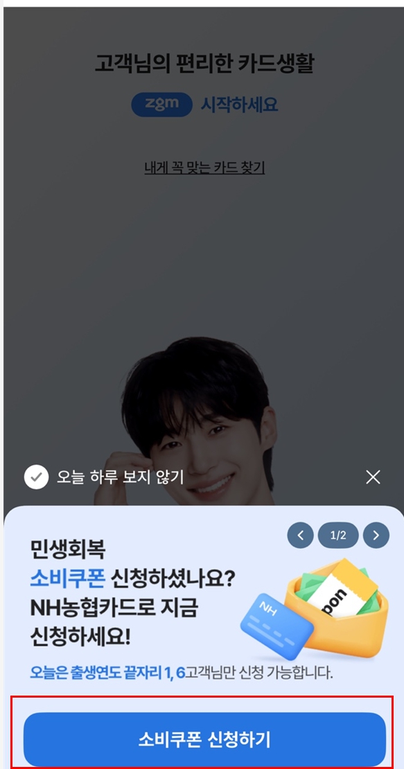 - 농협카드 앱에서 ‘민생회복 소비쿠폰’ 메뉴로 이동