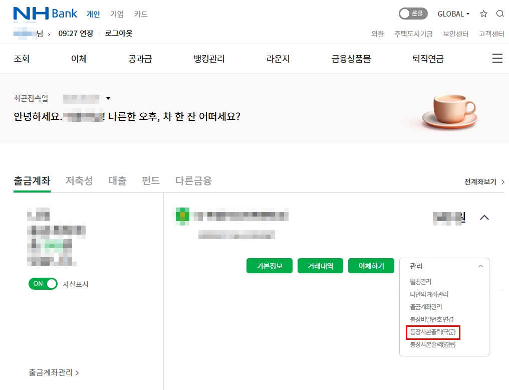 → https://banking.nonghyup.com - 메뉴 우측 ‘관리’ → ‘통장사본출력(국문)’ 클릭