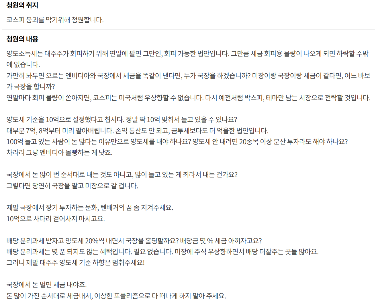 "코스피 붕괴를 막기 위해 청원합니다… 대주주가 연말에 팔면 그만인 회피 가능한 법안이에요"