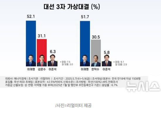 3자 가상대결 시 이재명 52.1%, 김문수 31.1%, 이준석 6.3%