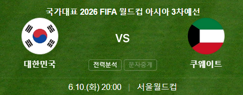서울월드컵경기장에서 대한민국 vs 쿠웨이트 2026 FIFA 북중미 월드컵 아시아 3차 예선 B조 최종전이 펼쳐집니다.