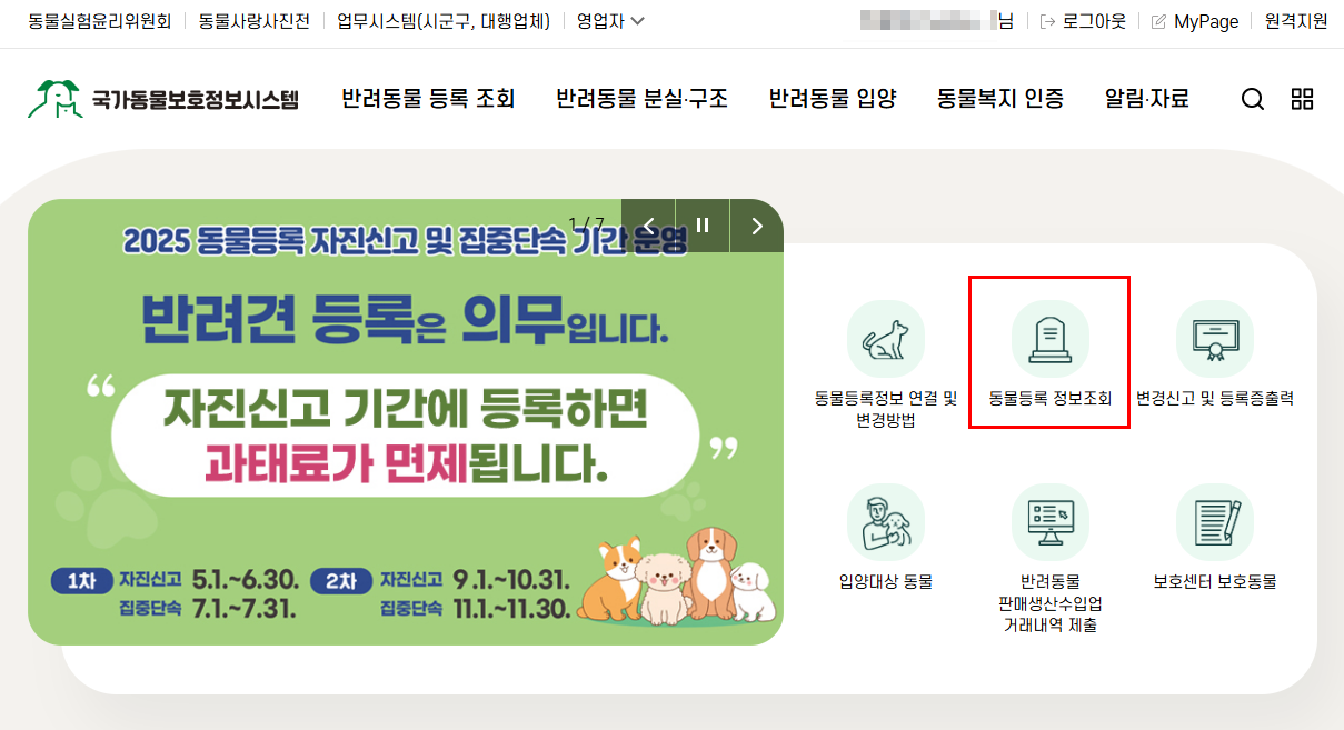 - 화면 중앙에 동물등록 정보조회(파란글씨) 클릭
