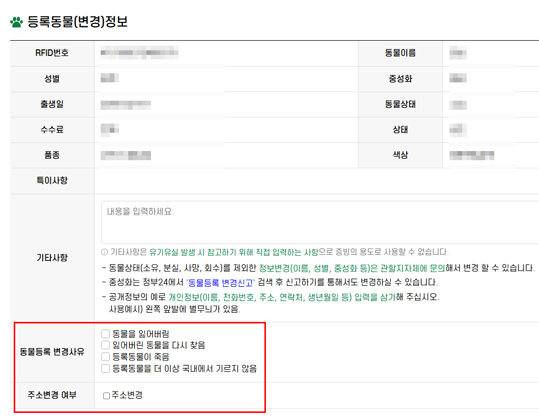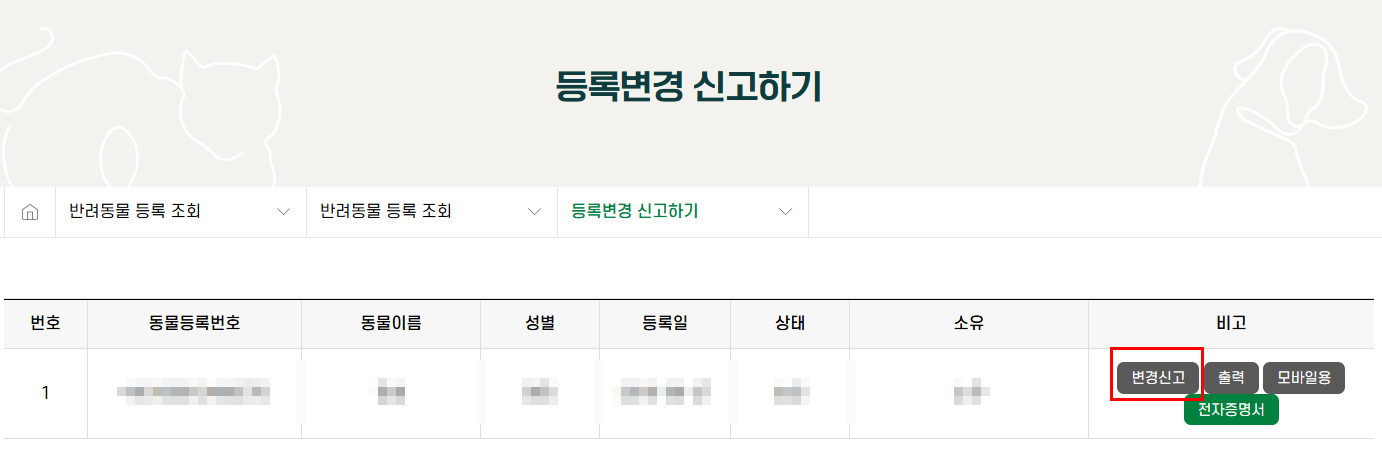 - 입력한 주민등록번호로 조회하여 등록되있는 동물이 보입니다.