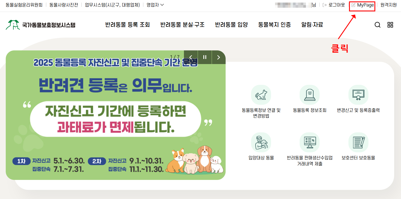 - 메인화면으로 이동하여 동물등록 정보조회 클릭