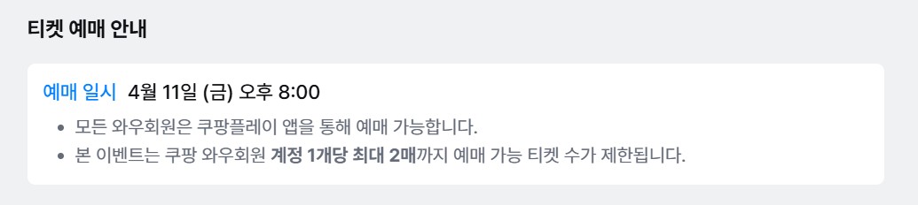 - 본 이벤트 예매는 쿠팡 와우회원 계정 1개당 최대 2매로 티켓 수가 제한됩니다.