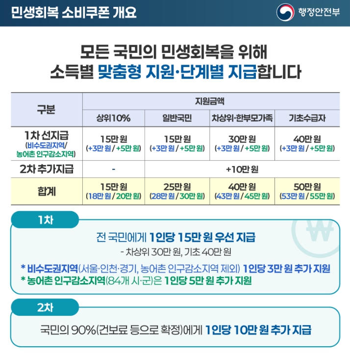| 1차 지급 | 7/21–9/12 일반15만, 차상위·한부모30만, 수급자40만 |