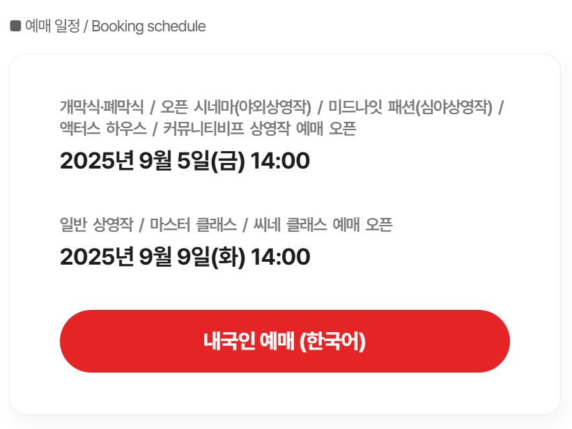 | 일반 상영작, 마스터클래스 등 예매 오픈 | 9월 9일(화) 오후 2시 |