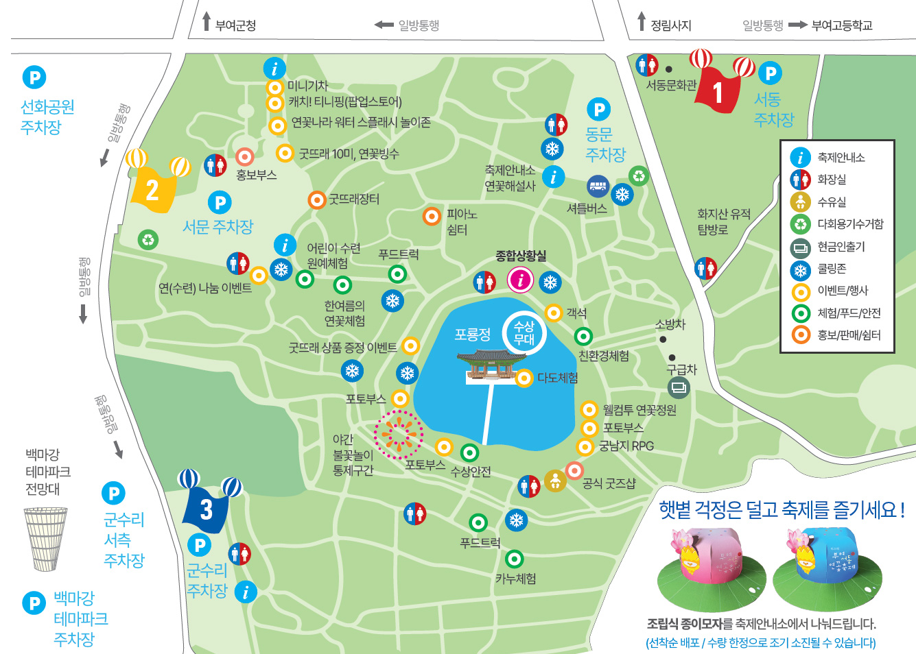 - 자가용: 궁남지 주변 공영주차장 이용 가능. 축제 기간 주말 혼잡 예상