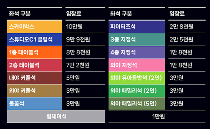 티켓 가격은 스카이박스 10만원에서 외야 지정석 1만8천원으로 다양하게 구성되어 있습니다.