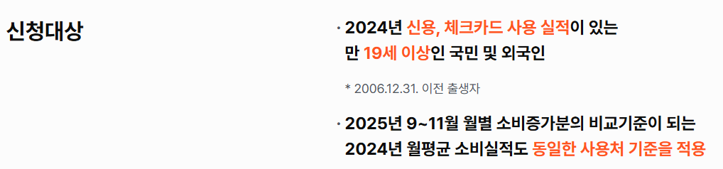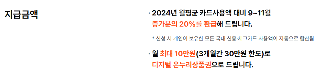 - 기준: 2024년 월평균 카드사용액 대비 2025년 9월부터 11월까지 월별 카드 소비액이 증가한 만큼의 20%를 디지털 온누리상품권으로 환급합니다.