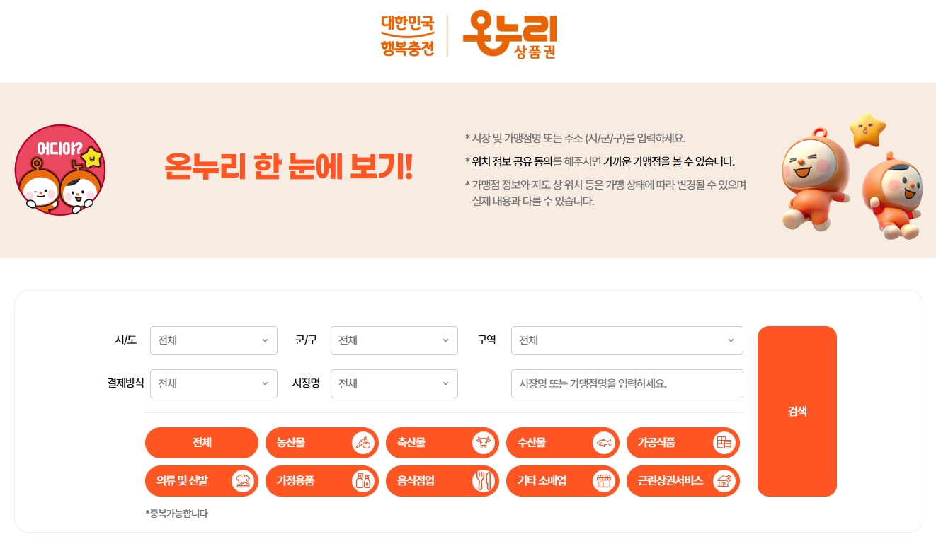 - 전통시장, 동네슈퍼, 문구점, 정육점, 반찬가게, 의류매장, 개인식당, 카페 등 지역 상권 및 소상공인 매장 중심