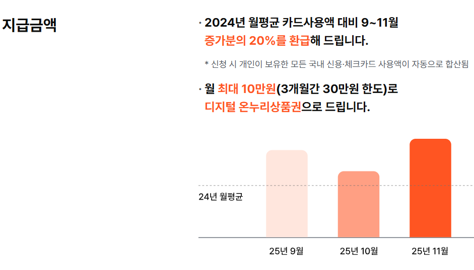 2025년 9월에 150만원을 썼다면 증가분 50만원의 20%인 10만원이 페이백으로 지급되는 구조예요.