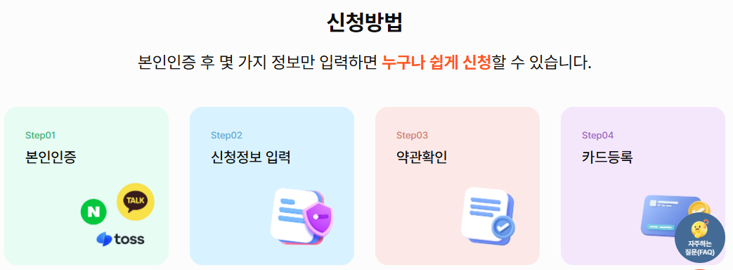 - 홈페이지 접속 → 본인인증 → 신청 완료. 별도 서류 제출 없이 신청 가능합니다.