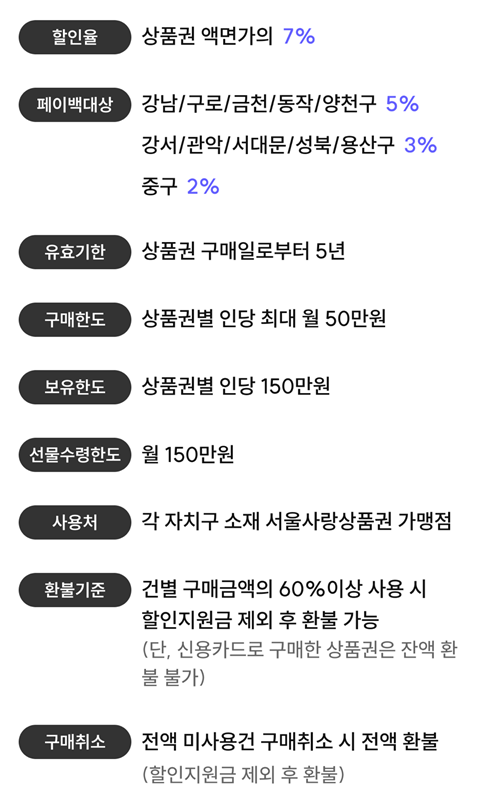 - 예: 강남구에서 30만 원 구매 → 21,000원 할인 + 15,000원 페이백 = 총 36,000원 혜택