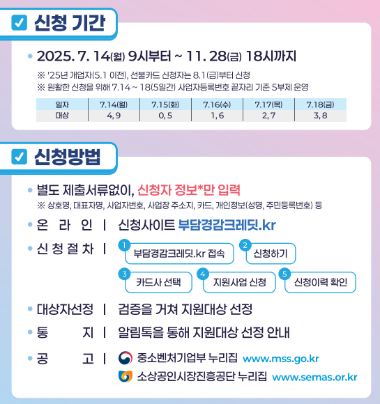 | 신청 방법 | 부담경감크레딧.kr 또는 소상공인24 |