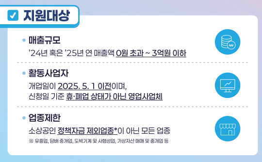 - 지원 대상은 연 매출 3억 이하 소상공인
