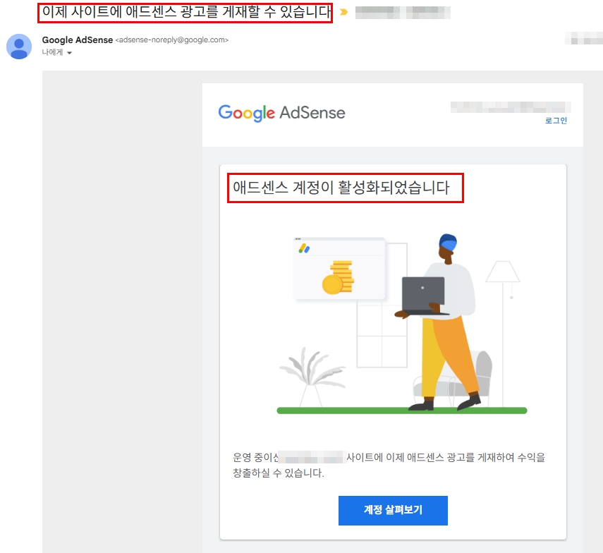 메일내용으로 '애드센스 계정이 활성화되었습니다'라고 옵니다.