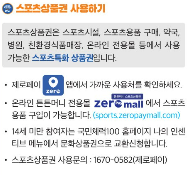 | 사용처 | 스포츠시설, 체육용품, 약국, 병원 등 제로페이 가맹점 |