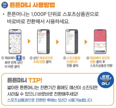 1회당 1,000포인트 적립, 연간 최대 50,000포인트까지 적립 가능하며, 스포츠용품 구매나 제로페이 가맹점에서 사용 가능
