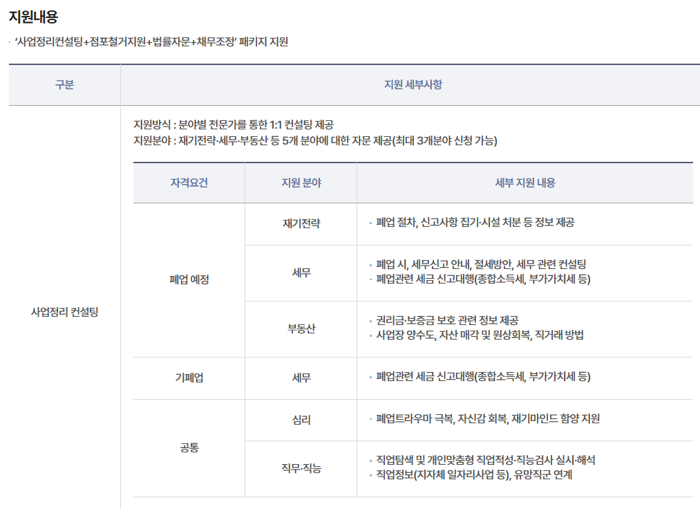 철거지원·심리상담·법률자문·재창업 교육까지 모든 폐업 절차를 한 번에 지원하는 정부 제도입니다.