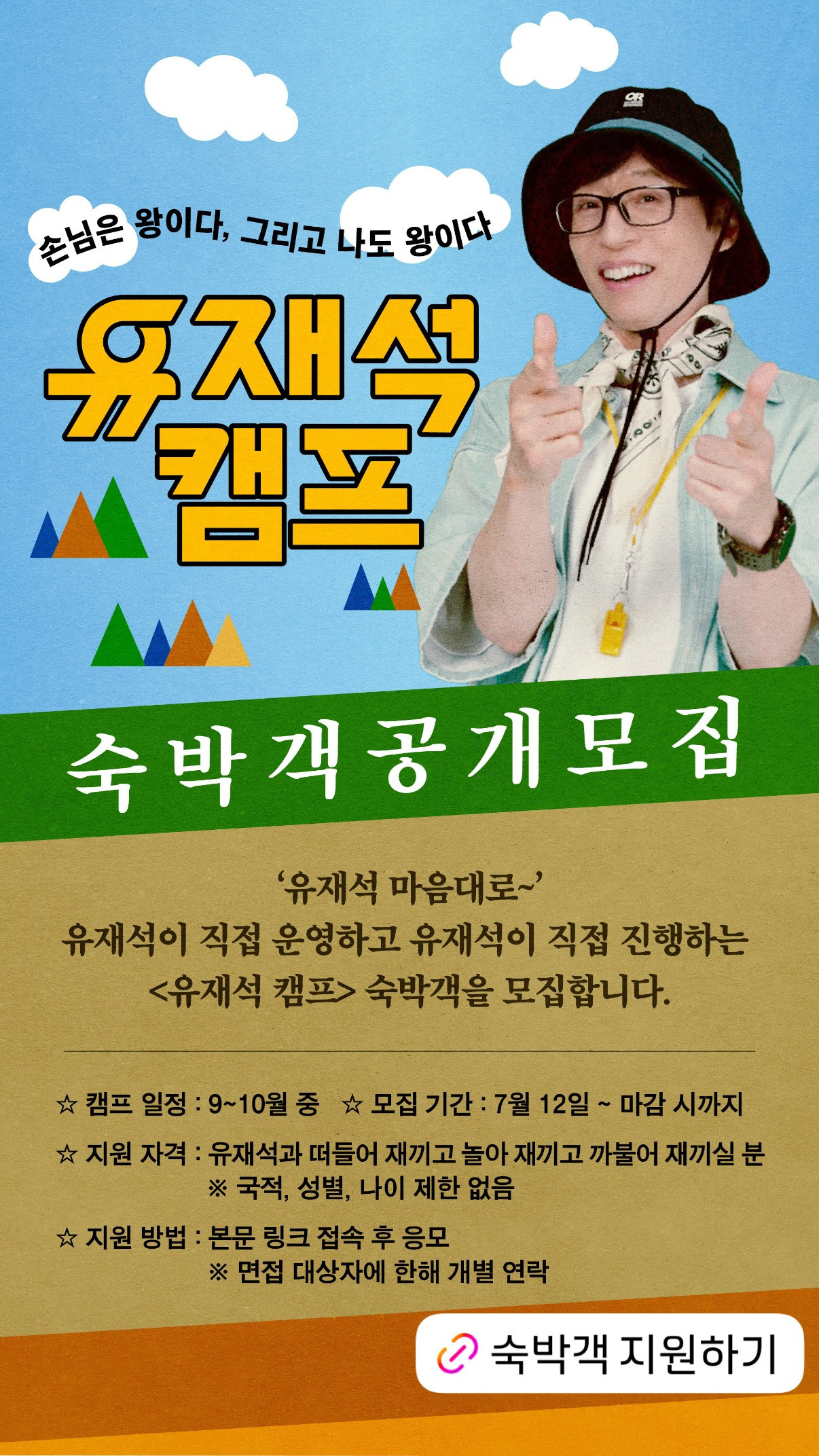 모두에게 열린 기회이니, “유재석과 캠핑하고 싶다!”는 마음이 있다면 지금 바로 도전해보세요!