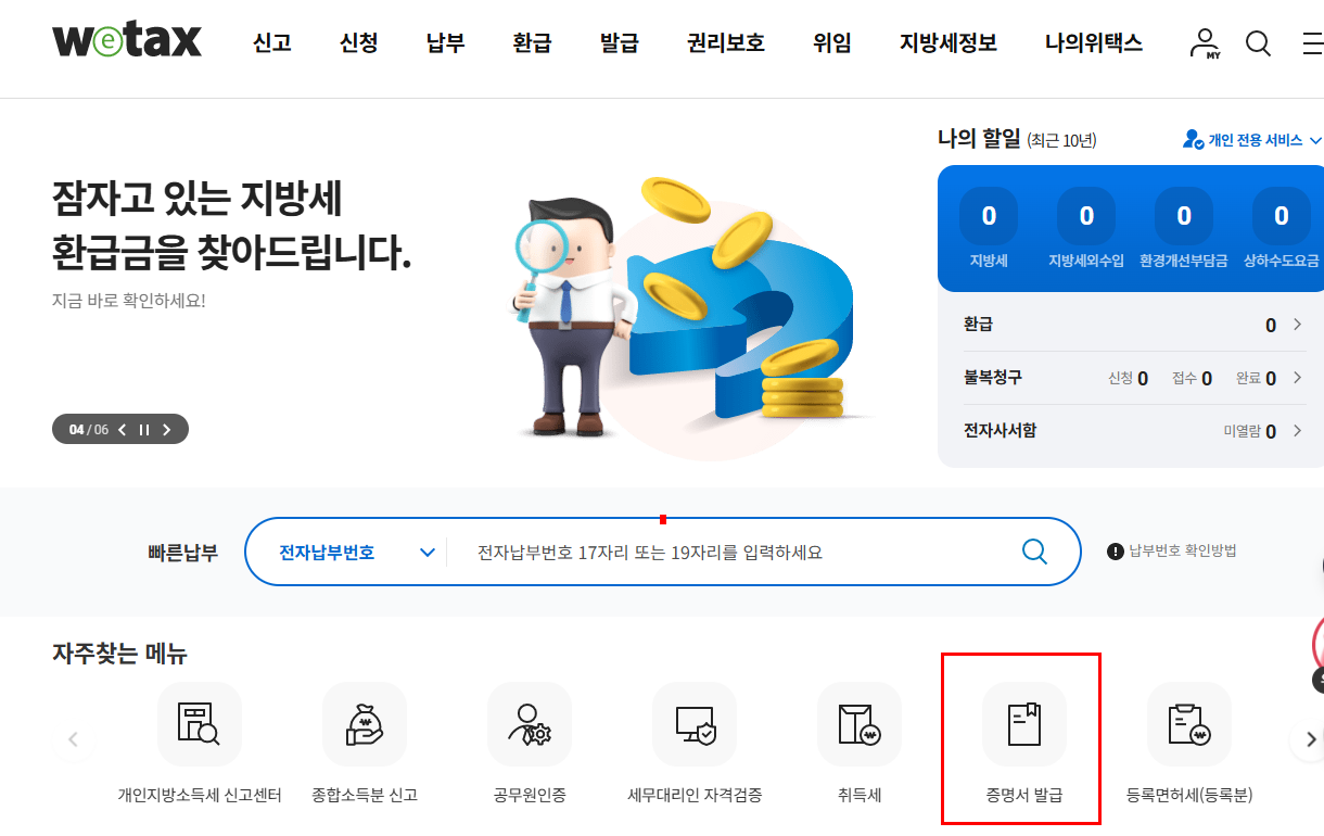 - 위택스 접속 > 증명서 발급 '신청하기'