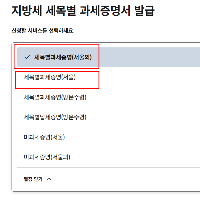 - 세목별과세증명 (서울 등록차량 서울 외 거주차량 구분하여 클릭)