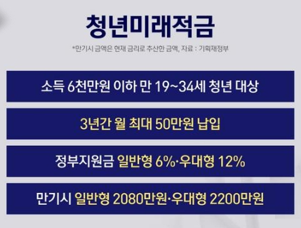 - 목적: 청년층의 목돈 마련을 위한 정부 지원 적금