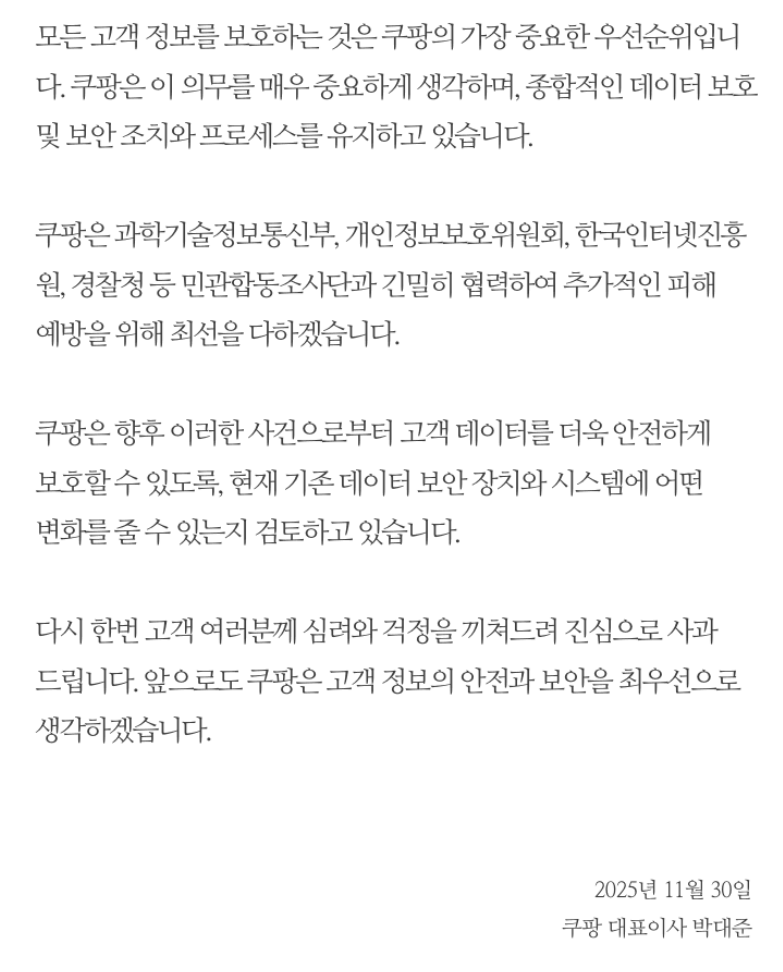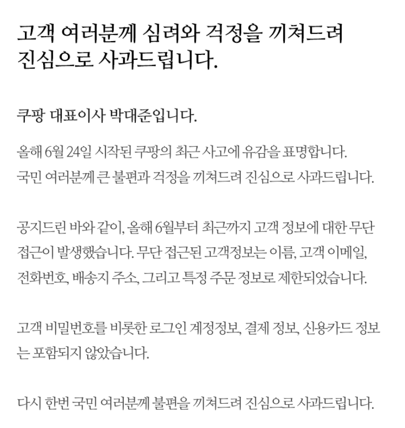 - 다만, 쿠팡 측은 결제 정보나 비밀번호·로그인 정보는 포함되지 않았다고 설명했습니다.