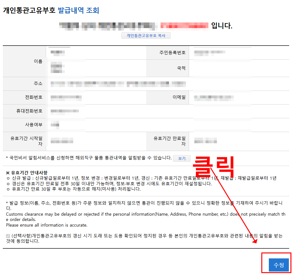 저는 개인통관번호 재발급과 함께 국민비서 통관 알림 서비스도 추가로 신청했습니다.