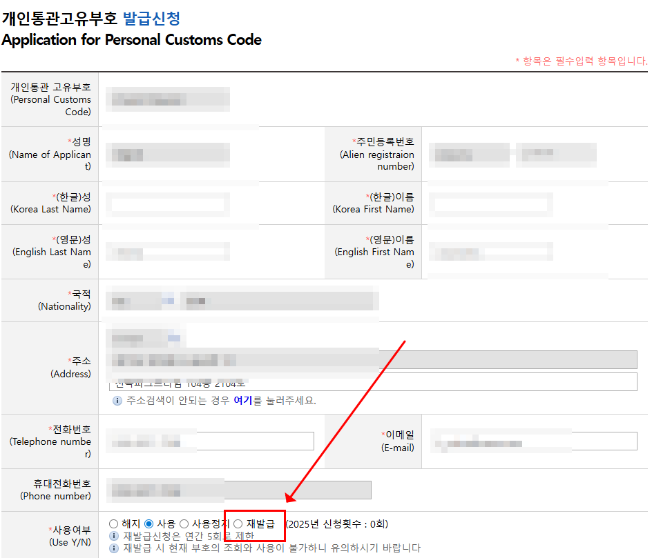 → 바로 새로운 개인통관번호 부여!