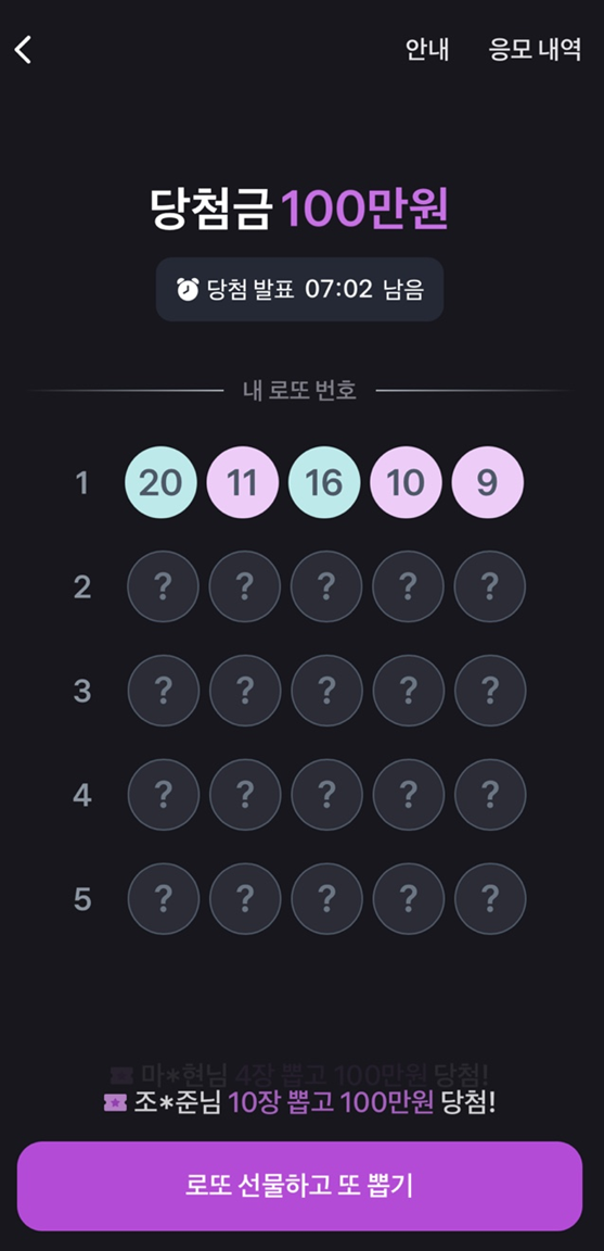 - 내용: 10분마다 100만 원 당첨 기회! 응모 번호와 당첨 번호의 숫자와 순서가 모두 일치하면 당첨!