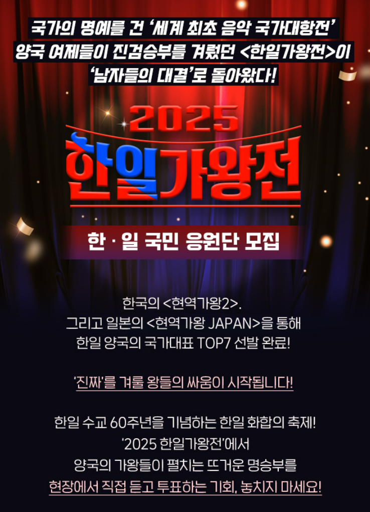 이번 포스팅에서는 많은 분들이 궁금해하는 ✅ 2025 한일 가왕전 일본 가수 투표 방법 ✅ 방청 신청 절차 ✅ 다시보기 및 재방송 보는 법까지 한 번에 정리해드립니다.
