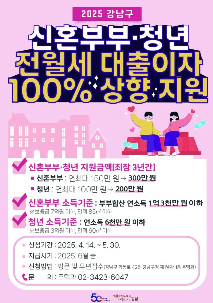 🏡 강남구, 신혼부부·청년 1인가구 전월세 대출이자 지원 확대!