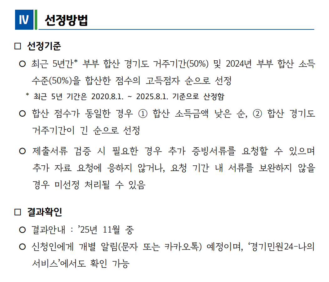동점자는 ➡️ 소득 낮은 순 > 경기도 거주기간 긴 순으로 우선 선정됩니다.