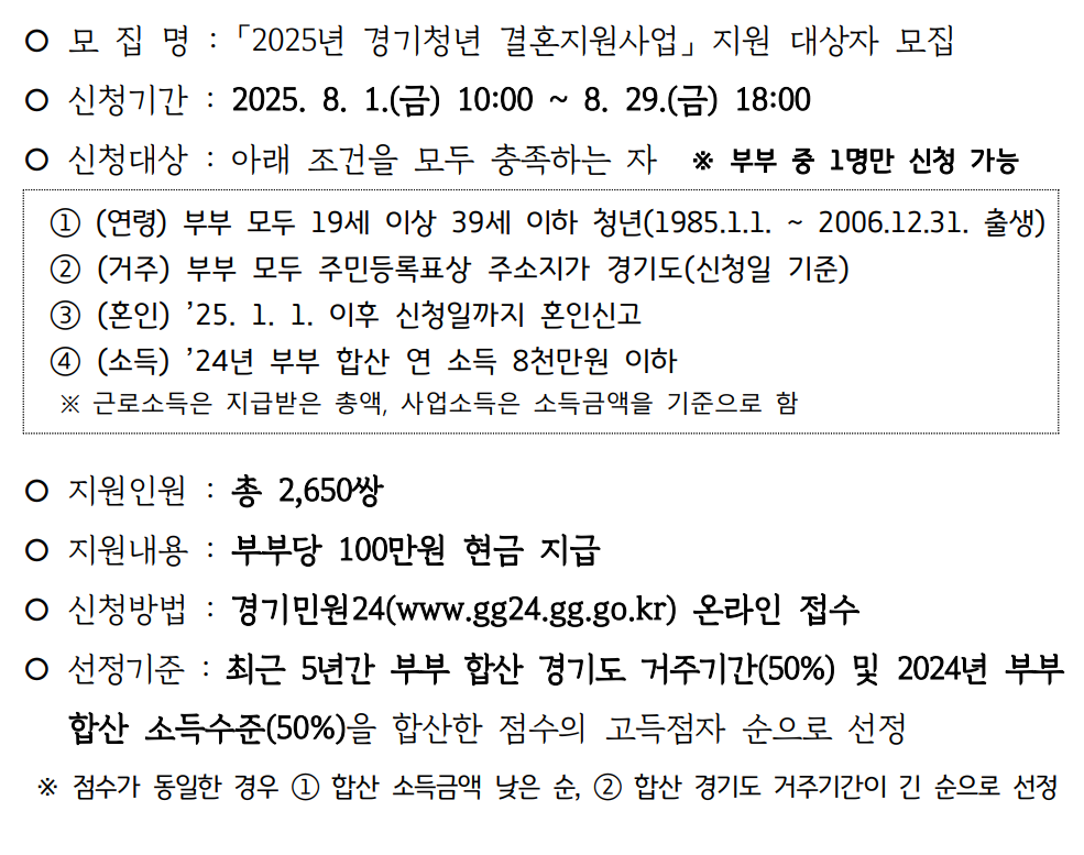 | 혼인시기 | 2025.01.01~08.29 사이 혼인신고 완료자 |