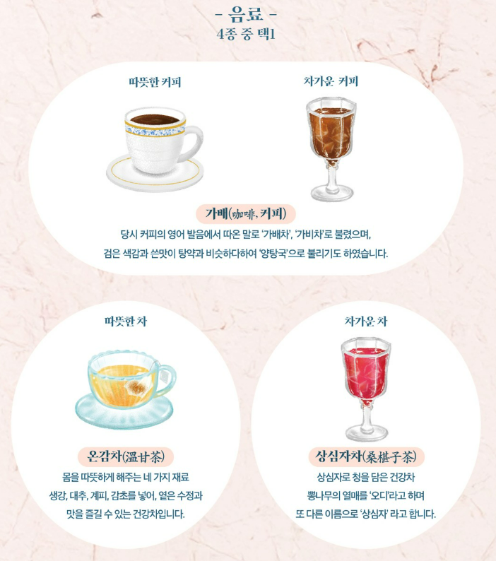 - 선택 음료: 따뜻한 가배, 차가운 가배, 상심자차(오디차), 온감차