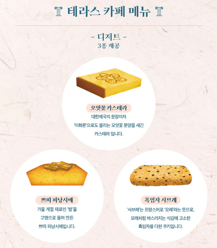- 제공 다과: 오얏꽃카스테라, 흑임자 사브레, 쁘띠 피낭시에