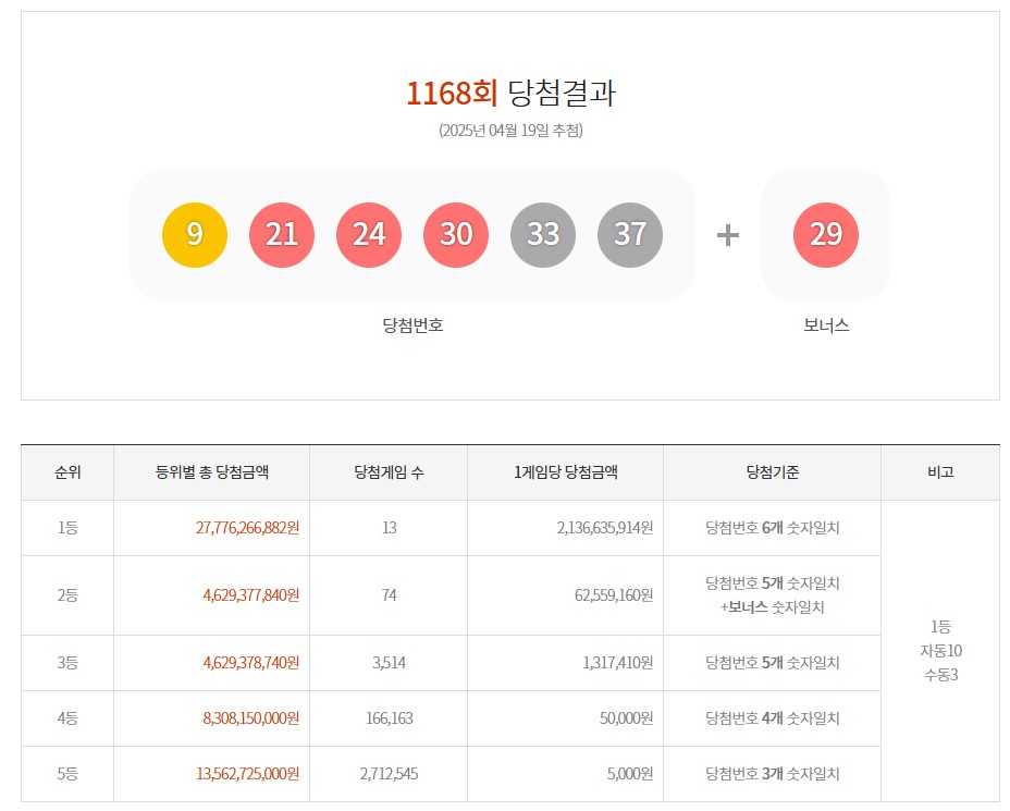 가장 최근 1등 당첨금은 약 21.3억 이네요! (2025년 4월 19일 추첨)