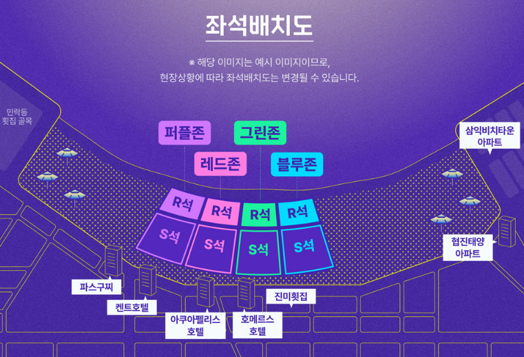 - 좌석 구역: R석(테이블, 의자 제공), S석(의자만), 퍼플존, 레드존 등 유료존 위치 다양