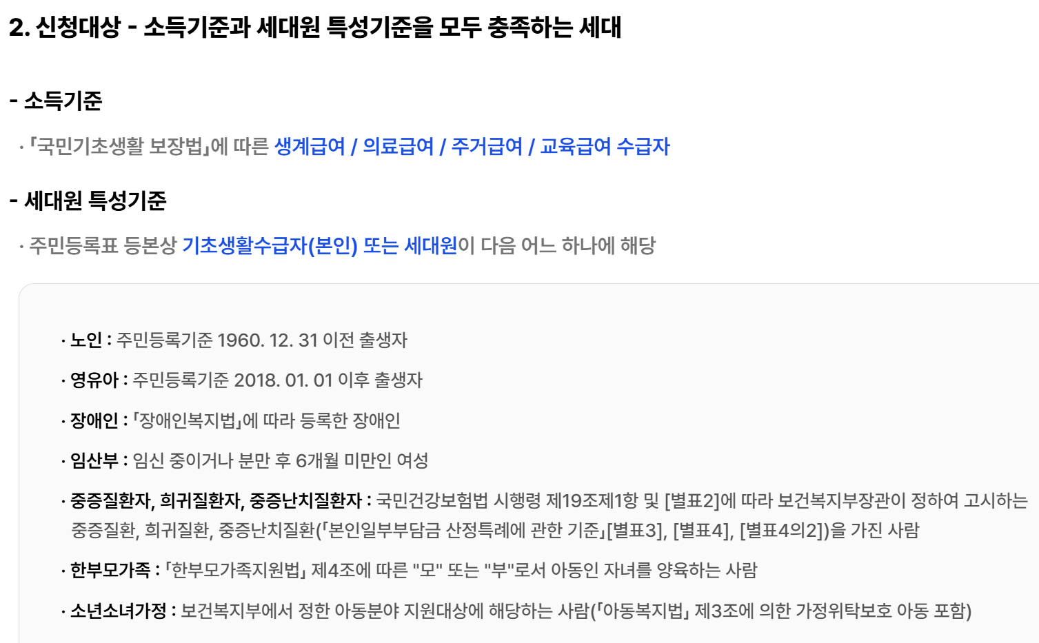 | 대상 | 기초생활수급자 + 특정 세대 조건 충족 |