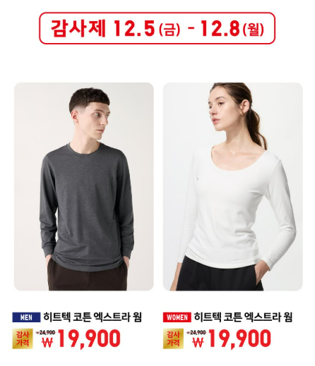| 👕 남성 · 여성 | 히트텍 코튼 엑스트라 웜 | 24,900 → 19,900원 |