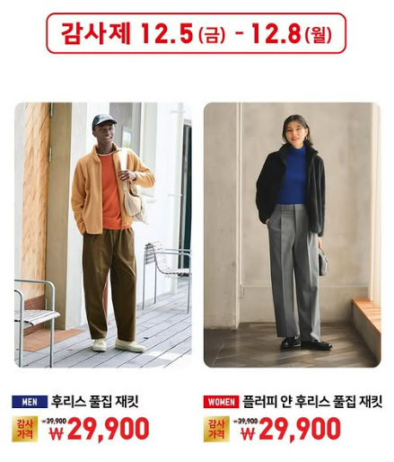 | 🧥 남성 | 후리스 풀집 재킷 | 39,900 → 29,900원 |
