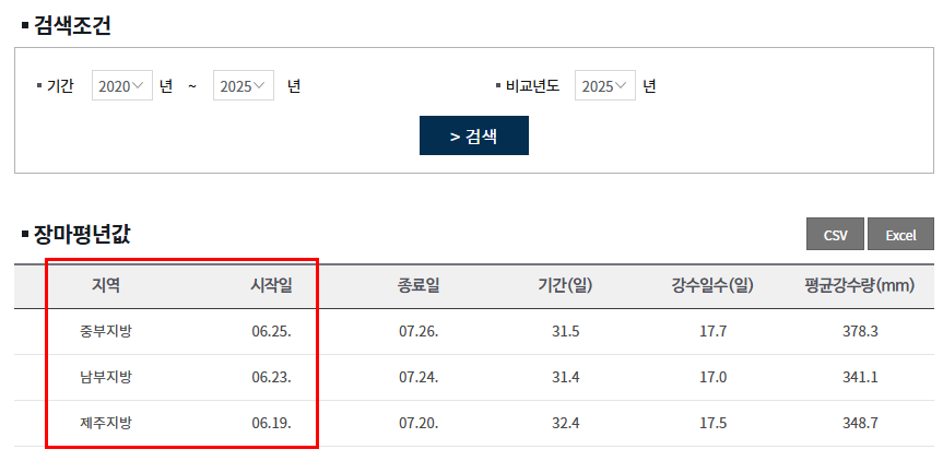 - 제주도: 6월 19일경 시작, 종료는 ~7월 20일 (약 32일)