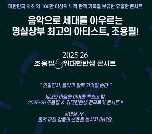 1980년대부터 지금까지 한국 대중음악의 살아 있는 전설인 조용필이,2025년에서 2026년 걸쳐 위대한탄생 밴드와 함께 전국투어 콘서트를 진행합니다.매번 예매 오픈 직후 매진되는 콘서트인 만큼,
