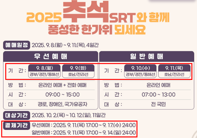 👉 9월 8일~11일: SRT 예매👉 9월 15일~18일: KTX 예매