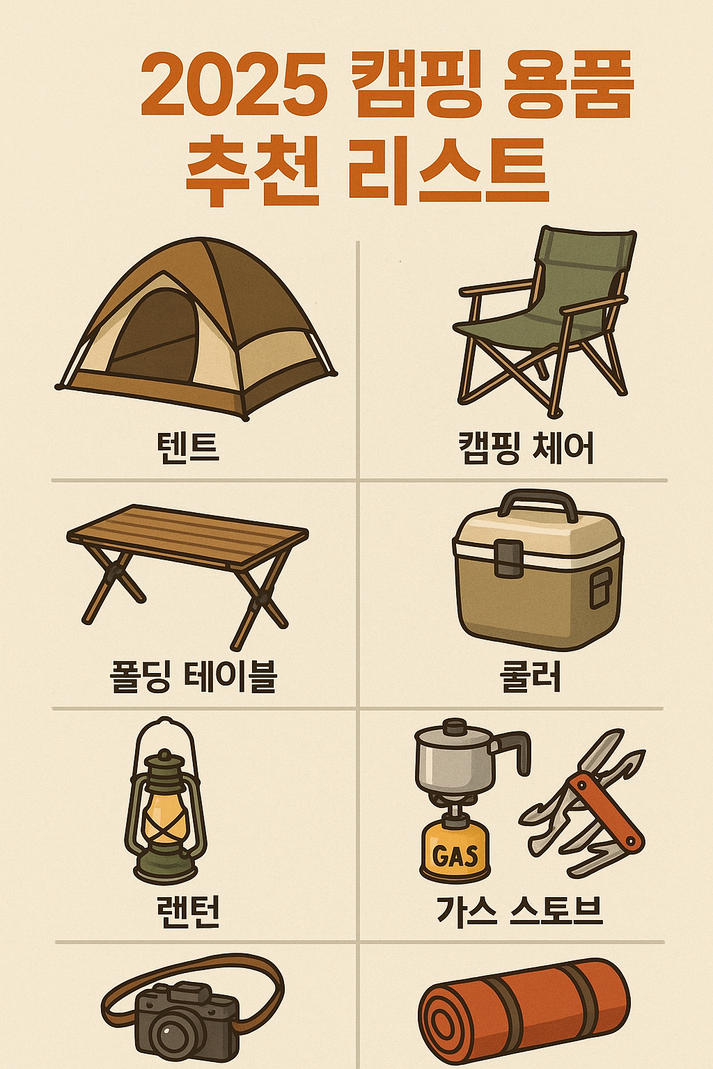 이번 글에서는 초보 캠퍼부터 고수까지 만족할 수 있는 2025년 최신 캠핑 용품 추천 리스트를 소개합니다.